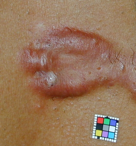 ケロイドと呼ばれるものには、赤みや痛みが強く、もとの傷の範囲を超えてどんどん拡大する「ケロイド」と、赤みや痛みはあるものの、拡大はせず、徐々に改善してくる「肥厚性瘢痕(ひこうせいはんこん)」があります。