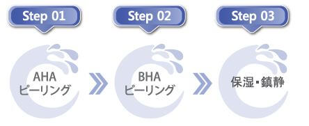Step1⇒水溶性AHAを使用し、肌表面の汚れや角質を除去
