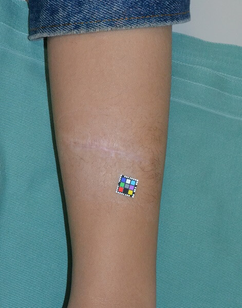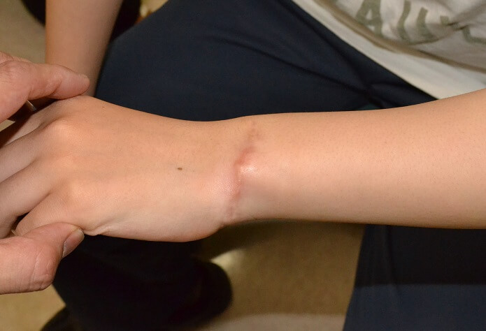 術後4か月です。ほぼ目立たなくなりました。アフターケアとして、半年間のテーピングを続けていただきました。
