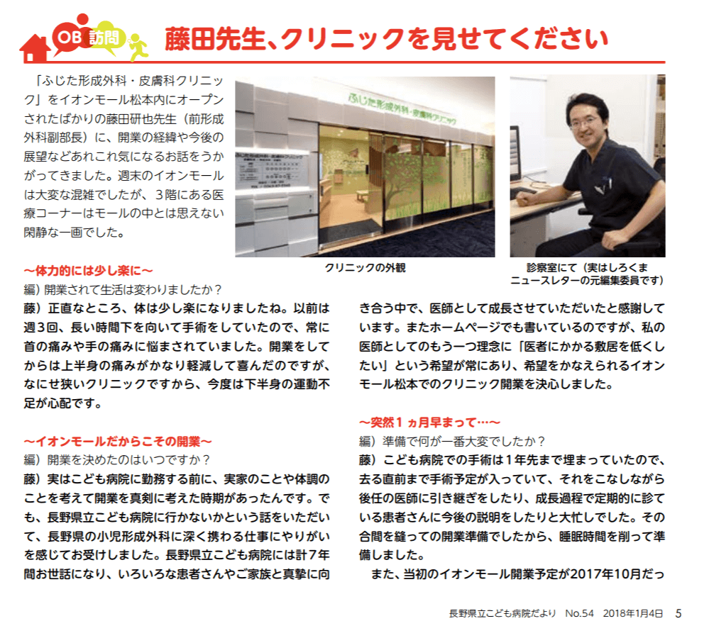 私の前勤務地であります、長野県立こども病院の広報誌「しろくまニュースレター」に、当院を取り上げていただきました。