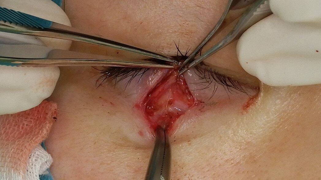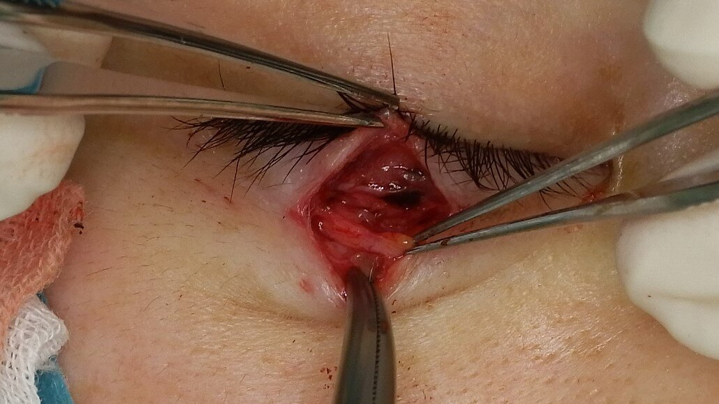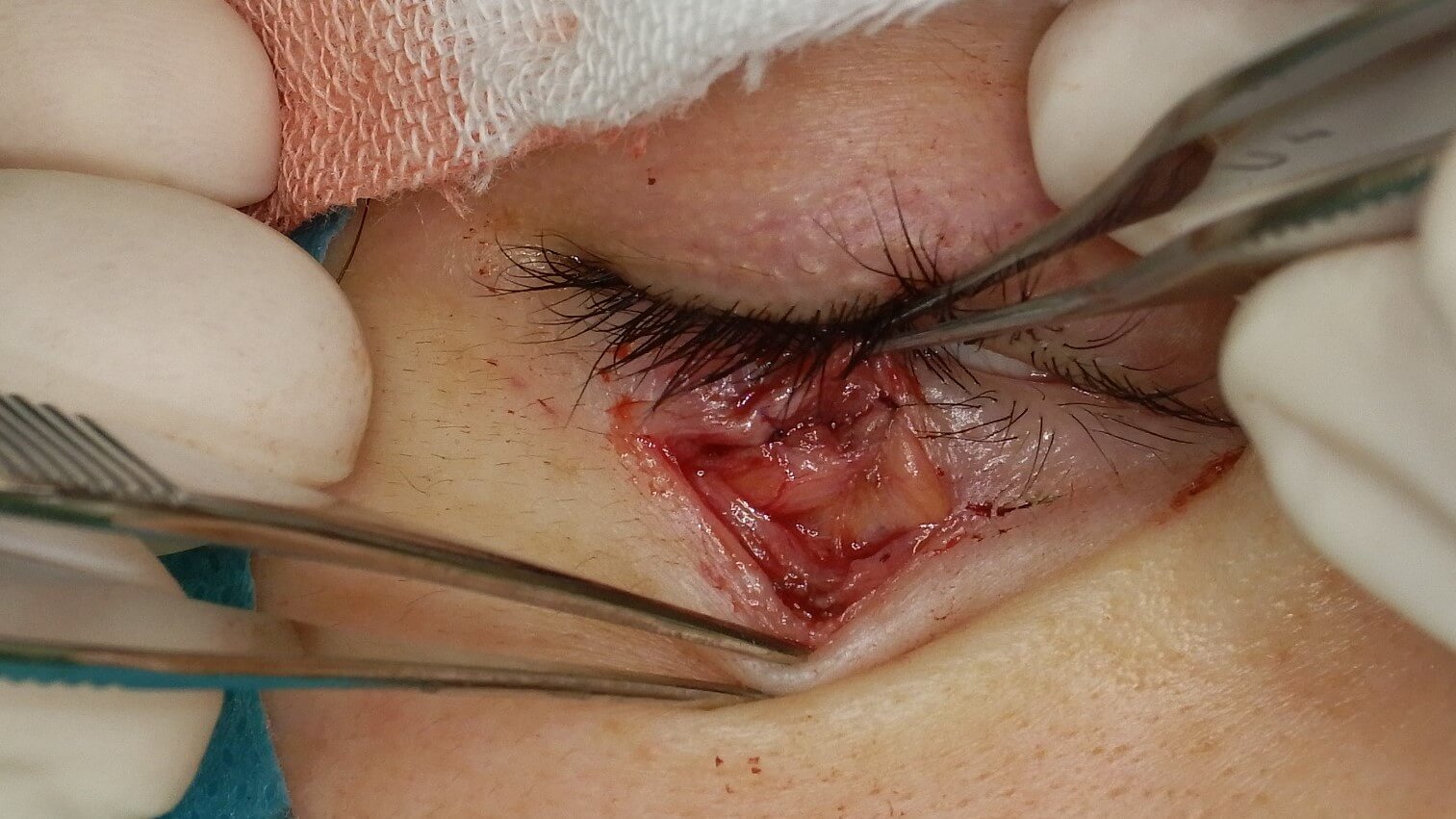 手術中。上から2番目のピンセットでつまんでいるのは下眼瞼を開く筋肉につながる筋膜です。瞼板に付着しています。